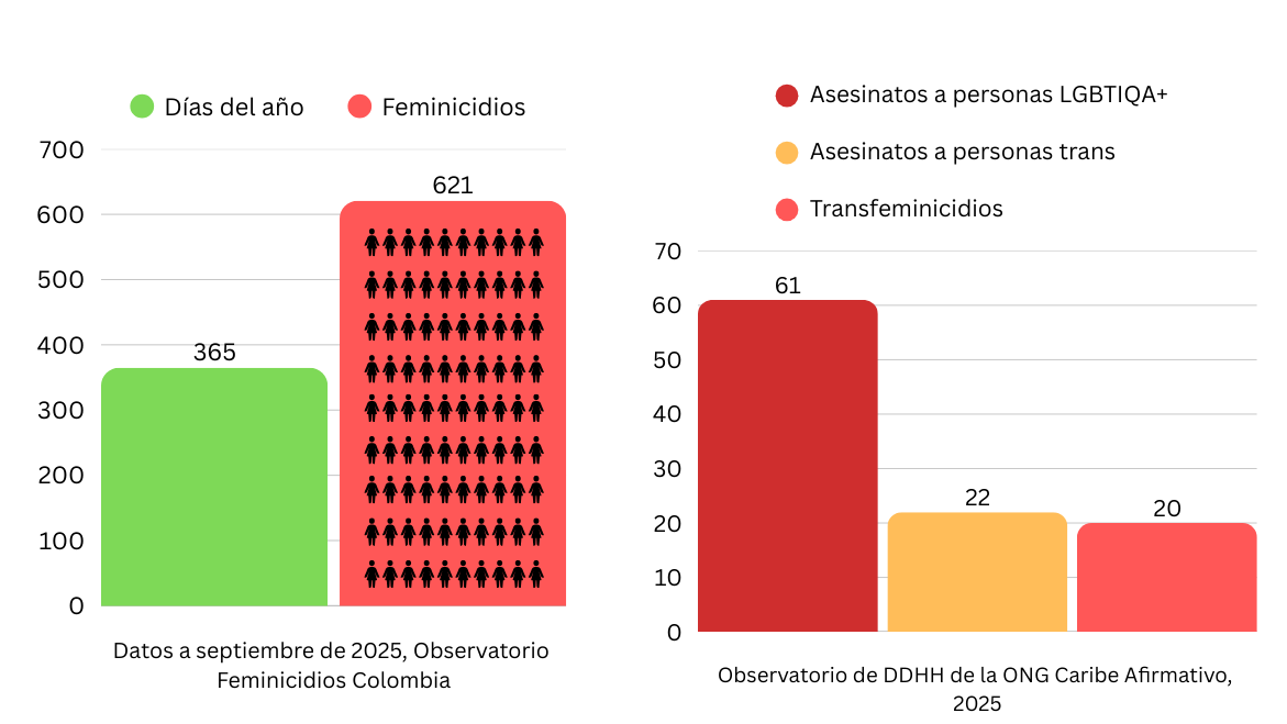 A septiembre de 2025, el país reportaba al menos 623 feminicidios documentados, muchos de ellos sin resolución [1]. Mientras tanto, otros estudios estiman que durante el primer semestre del año, el dato fue cercano a los 342 casos, lo cual evidencia que se podría superar la cifra dada su tipificación imprecisa y el subregistro [2]. Además, en los informes presentados se señalan asesinatos contra personas de orientación sexual, identidad y expresión de género diversa —al menos 61 asesinatos de personas LGBTIQA+ de las cuales al menos 22 son personas trans, correspondiendo 20 a mujeres trans— lo cual demuestra que esta violencia también ata a las diversidades sexuales a la lógica mortal del patriarcado [3]. Las denuncias por violencia basada en género suman también cifras alarmantes: hasta el 8 de junio de 2024 se registraron 66.621 casos en Colombia, de los cuales el 75,6 % (≈ 50.374) afectaron a mujeres [4].